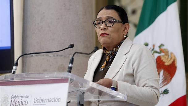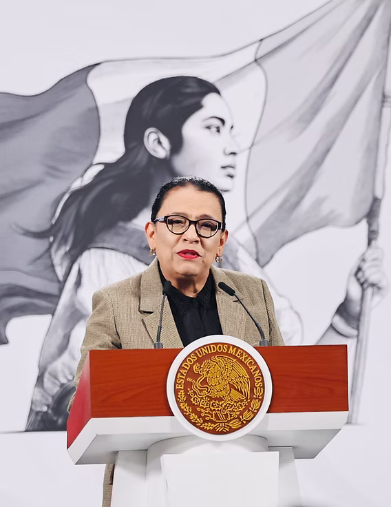 Secretaria Rosa Icela Rodríguez, durante la conferencia de prensa sobre los bloqueos y manifestaciones anunciadas por productores agrícolas