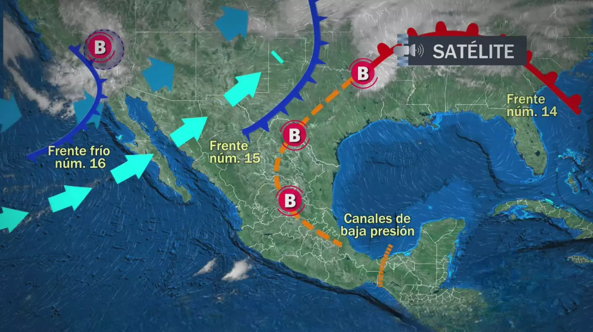 El pronóstico a 72 horas indica que el frente No. 16 en interacción con un canal de baja presión, mantendrá la probabilidad de chubascos y lluvias fuertes a muy fuertes en la Península de Yucatán, el noreste, oriente y sureste del territorio nacional.