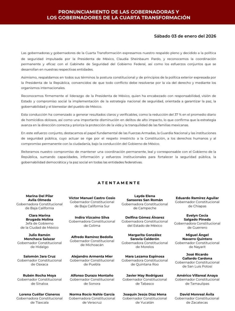 Gobernadores y gobernadoras del país expresaron públicamente su respaldo a la presidenta de México, Claudia Sheinbaum, al reconocer su postura diplomática y su llamado al respeto a la soberanía de las naciones, luego de los acontecimientos recientes en Venezuela que…