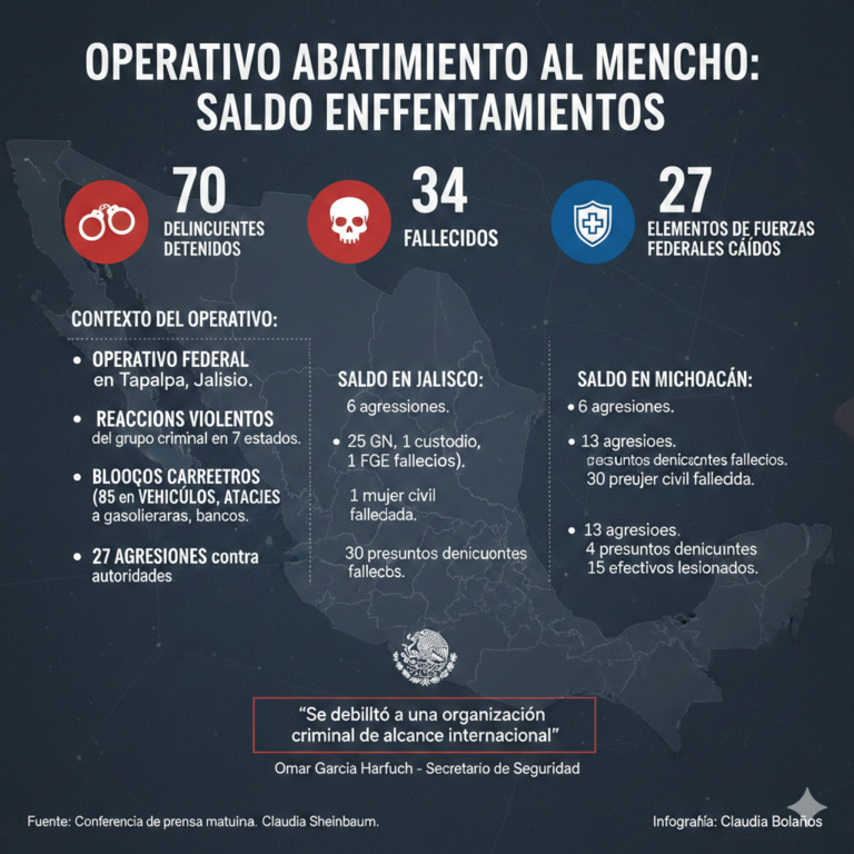 70 delincuentes detenidos, 34 fallecidos y 27 elementos de Fuerzas Federales caídos, saldo de operativo de abatimiento al Mencho