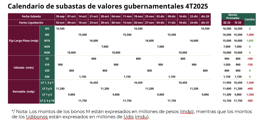 La Secretaría de Hacienda y Crédito Público informa que el Programa de Subastas de Valores Gubernamentales correspondiente al cuarto trimestre de 2025 entrará en vigor a partir del 1 de octubre.