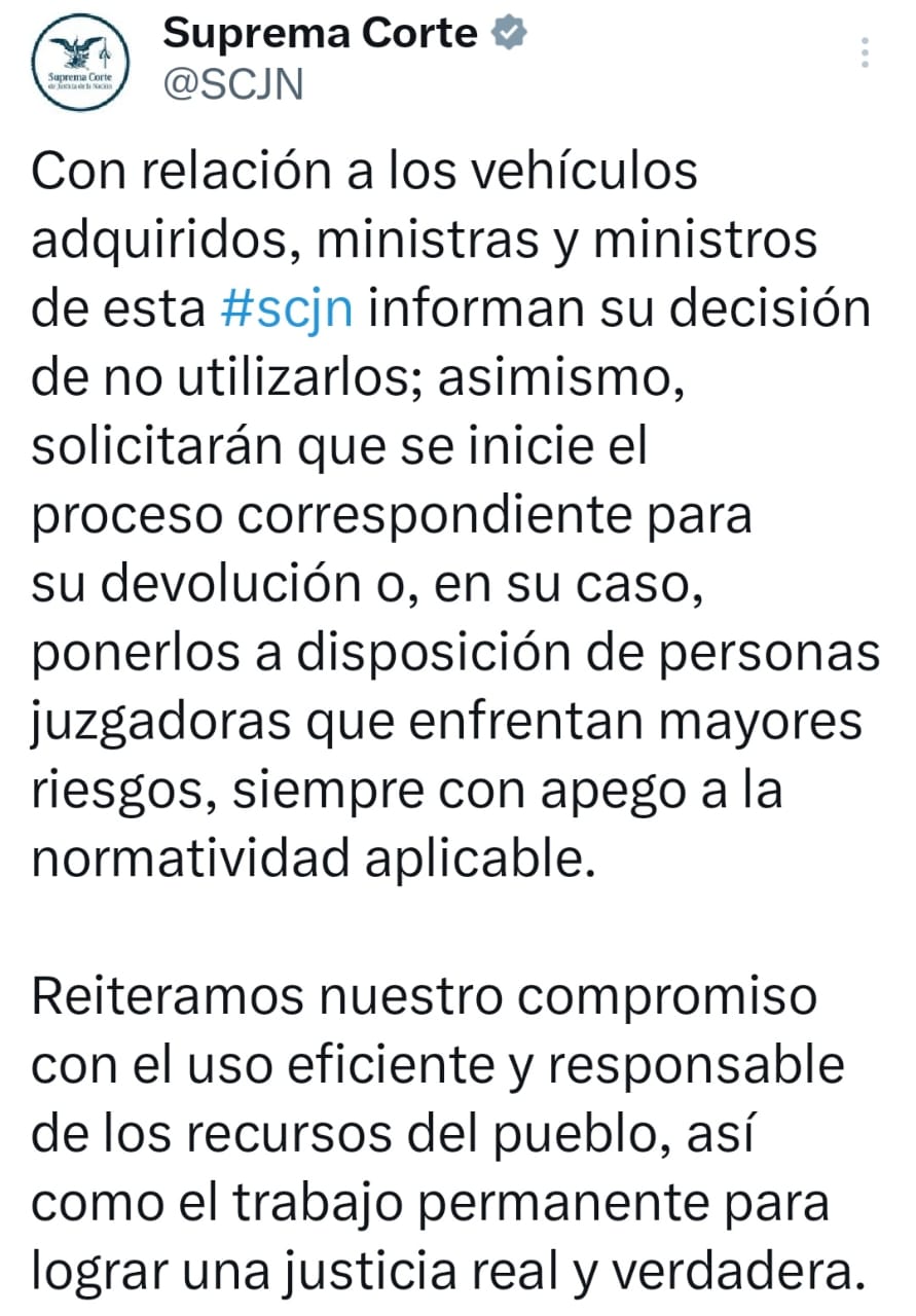 “Con relación a los vehículos adquiridos, ministras y ministros de esta #scjn informan su decisión de no utilizarlos; asimismo, solicitarán que se inicie el proceso correspondiente para su devolución o, en su caso, ponerlos a disposición de personas juzgadoras que enfrentan mayores riesgos, siempre con apego a la normatividad aplicable. Reiteramos nuestro compromiso con el uso eficiente y responsable de los recursos del pueblo, así como el trabajo permanente para lograr una justicia real y verdadera.
