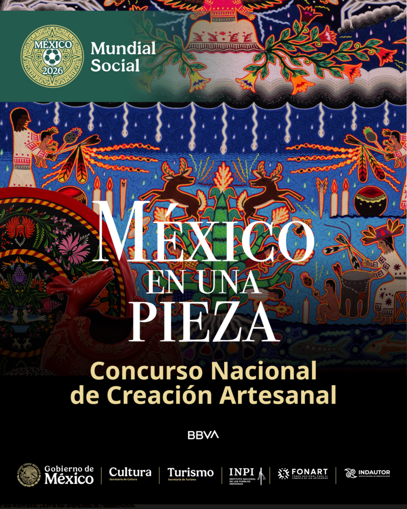 El Gobierno de México –a través de la Secretaría de Cultura, mediante el Fondo Nacional para el Fomento de las Artesanías (Fonart) y el Instituto Nacional del Derecho de Autor (INDAUTOR), en colaboración con la Secretaría de Turismo– y BBVA México, vía Fomento Cultural BBVA México, con el apoyo del Instituto Nacional de los Pueblos Indígenas (INPI), lanza el Concurso Nacional de Creación Artesanal: “México en una pieza”, dirigido a colectivos, talleres y agrupaciones de artesanas y artesanos mexicanos a crear piezas que funjan como recuerdo turístico.