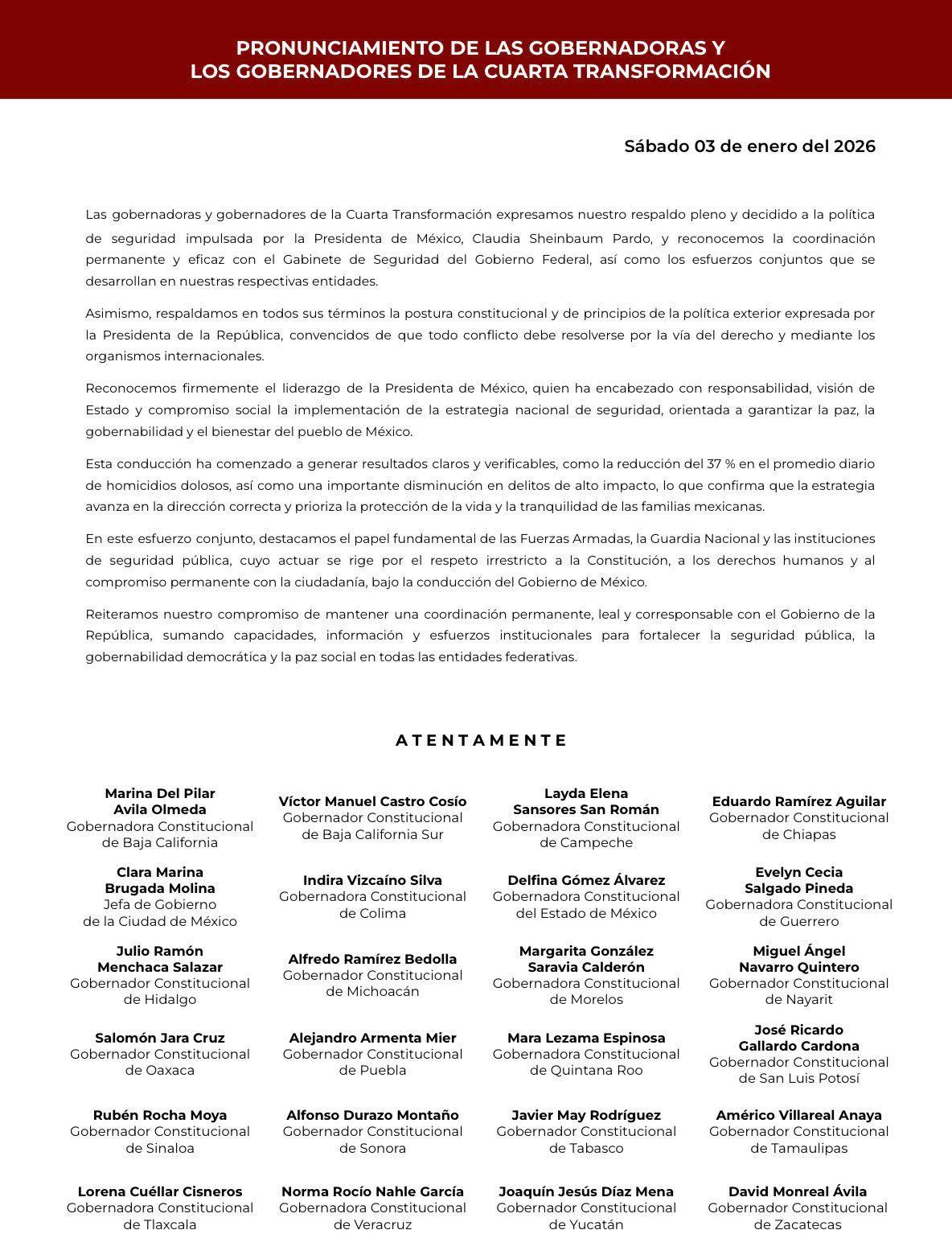Los gobernadores reiteraron que mantendrán comunicación permanente con el Gobierno de la República y respaldarán las acciones diplomáticas que privilegien el respeto al derecho internacional, la protección de la soberanía y la defensa de los principios históricos que han guiado la política exterior de México. Con ello, reforzaron el mensaje de unidad institucional en un contexto marcado por la atención global a la crisis política en Venezuela y sus posibles efectos en la región.