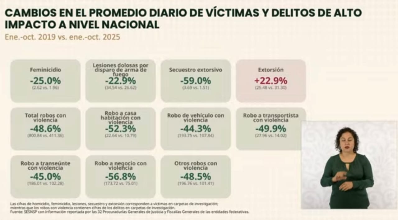 El informe detalla que en septiembre de 2024 el promedio diario era de 86.9 asesinatos, mientras que para octubre de 2025 disminuyó a 54.6 casos por día, siendo este mes el de menor registro en los últimos 13 meses.