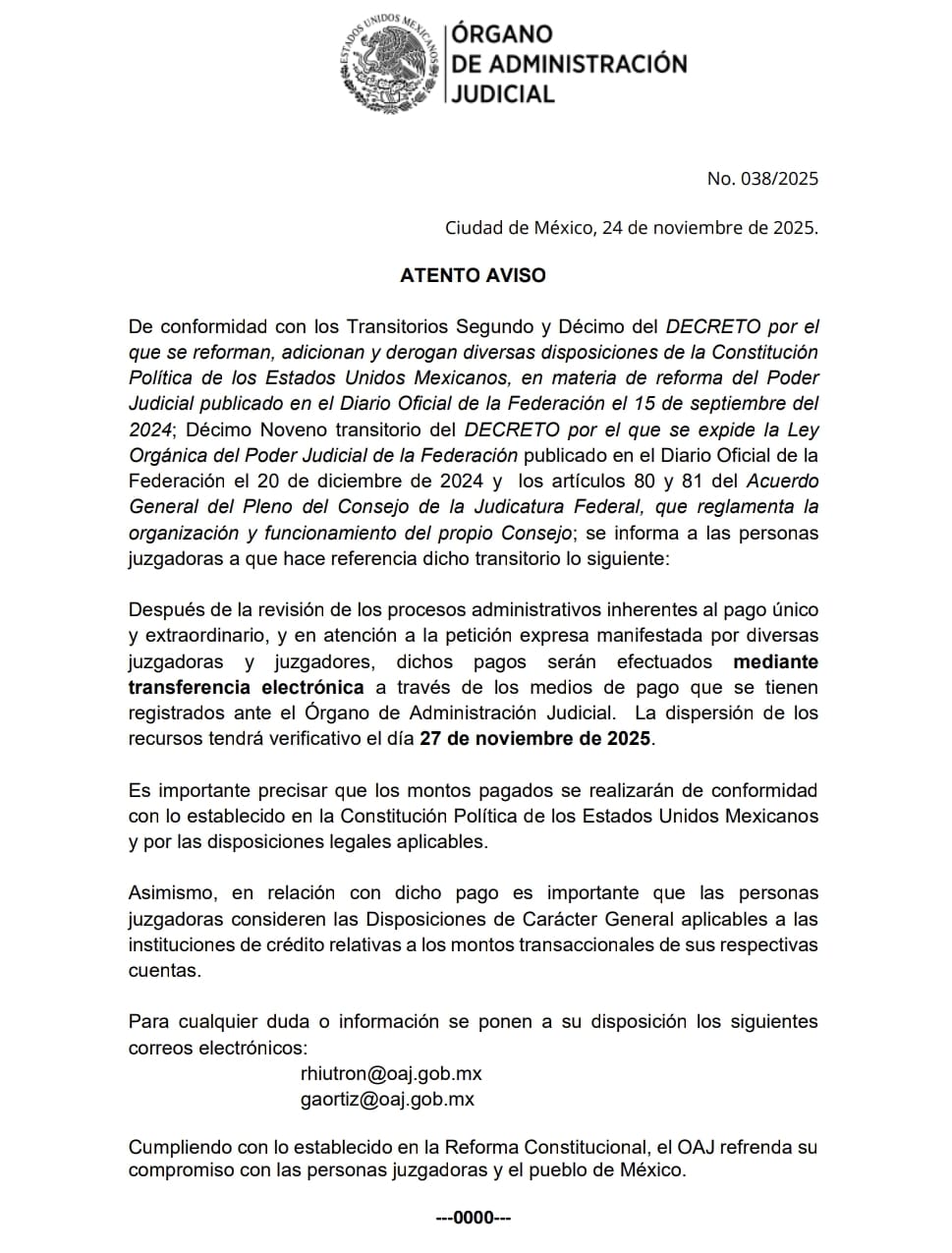 El Órgano de Administración Judicial informó que el pago único y extraordinario para las personas juzgadoras, previsto en los transitorios de la reforma al Poder Judicial y en la Ley Orgánica correspondiente, será dispersado el 27 de noviembre mediante transferencia electrónica a las cuentas registradas ante la institución.