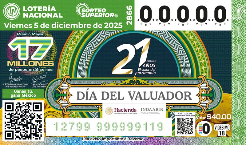 El Sorteo Superior No. 2866 que reconoce la profesión del valuador y su aporte social, tiene un Premio Mayor de 17 millones de pesos en dos series, así como una bolsa repartible de 51 millones de pesos en premios y se celebrará el viernes 5 de diciembre a las 20:00 horas.