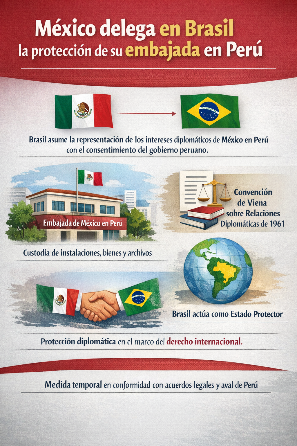 El gobierno de México informó que Brasil asumió formalmente la representación de los intereses diplomáticos mexicanos en Perú, tras una solicitud expresa de la administración mexicana y con el consentimiento del gobierno peruano, como parte de los mecanismos previstos en el derecho internacional.