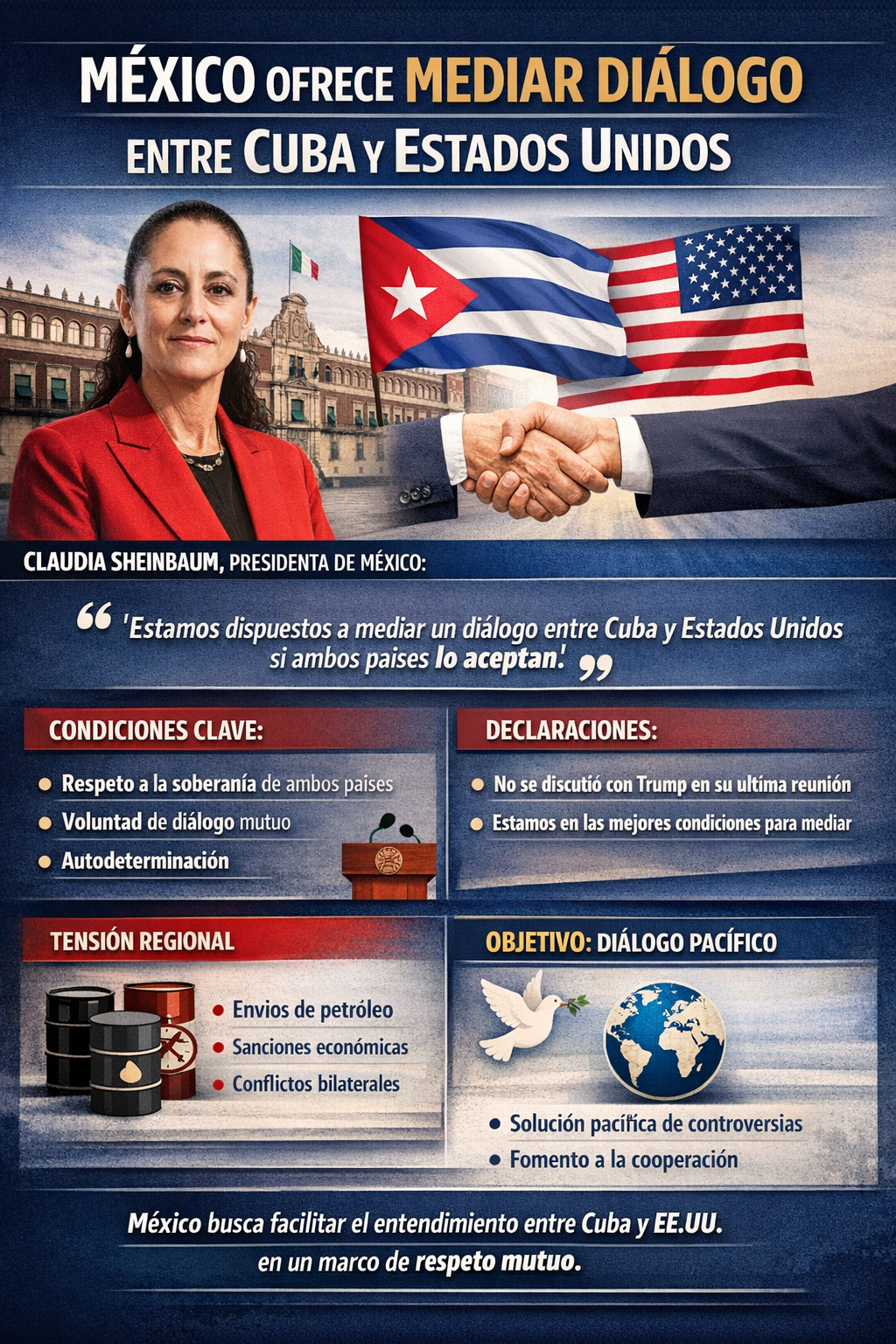 La presidenta Claudia Sheinbaum Pardo afirmó que México está dispuesto a fungir como mediador para facilitar un diálogo entre Cuba y Estados Unidos, siempre y cuando ambas naciones acepten esta posibilidad y manifiesten su voluntad de entablar conversaciones.
