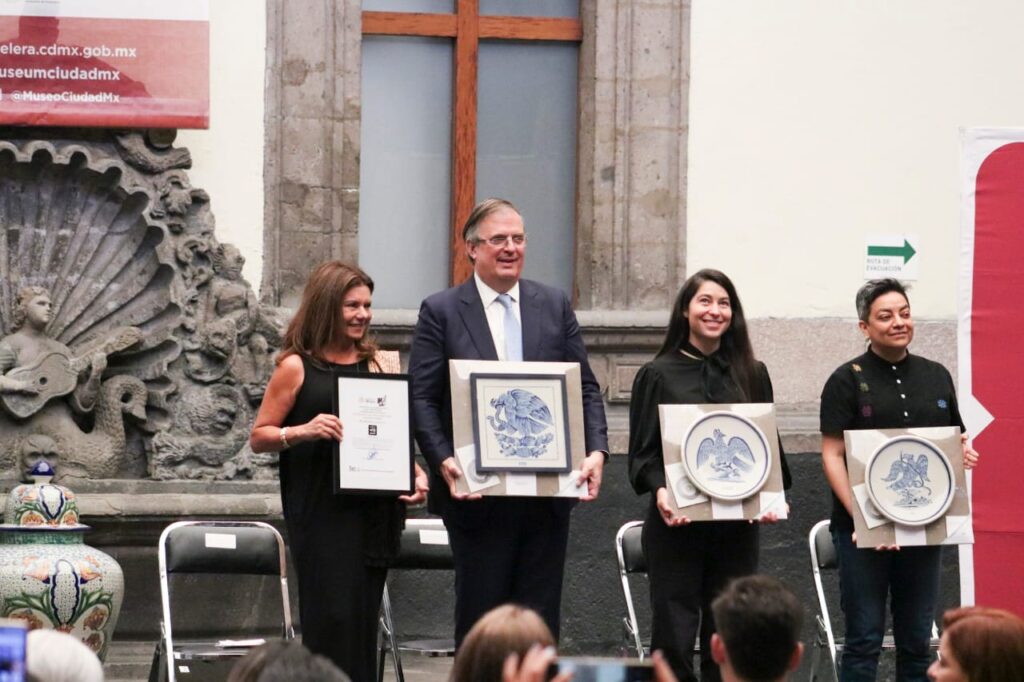 Secretario de Economía, Marcelo Ebrard Casaubon (MEC): Bueno, hola, ¿cómo les va? Gracias por acompañarme brevemente. Ya escucharon ustedes, pero les sintetizo, es una colección de imágenes de las águilas de México del año 500 después de Cristo a la fecha actual. Es una recopilación histórica en la que participaron pues varios historiadores, señaladamente Enrique Florescano, Rafael López, la doctora Alejandra Moreno y que Angélica Moreno llevó a la Talavera con técnicas, como ya dije, del siglo XVII, fines del siglo XVI, principios del siglo XVII.
