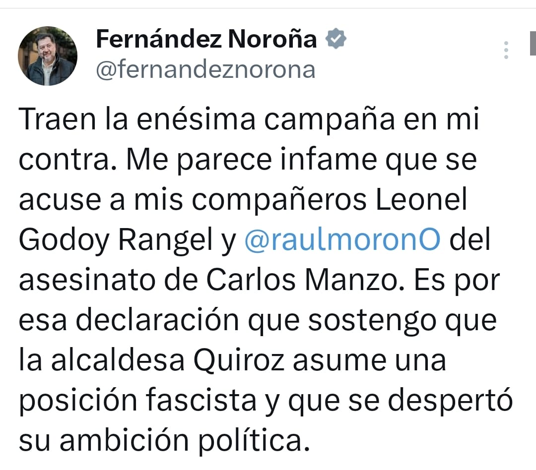 La presidenta Claudia Sheinbaum pidió al senador morenista Gerardo Fernández Noroña actuar con sensibilidad y respeto hacia Grecia Quiroz, viuda del alcalde de Uruapan, Carlos Manzo, quien ahora lo sustituye en el cargo luego de ser asesinado en un evento público, tras las declaraciones del legislador Fernández Noroña, quien acusó a la nueva alcaldesa de dejarse llevar por la ambición política y adoptar una postura fascista de ultraderecha.