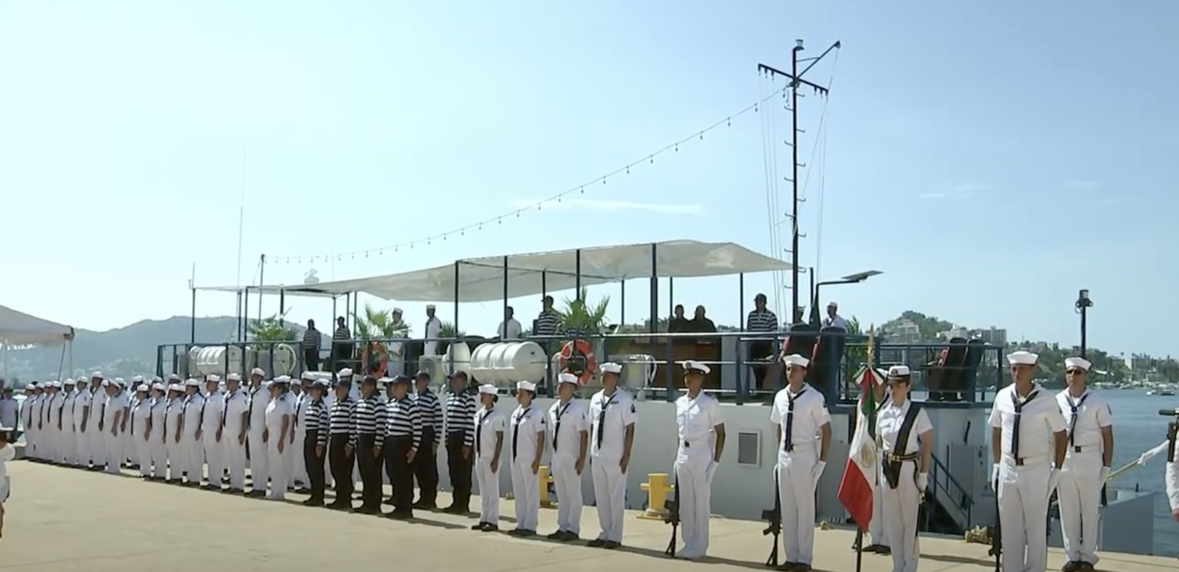 La Comandanta Suprema de las Fuerzas Armadas hizo entrega de la Bandera Nacional al Comandante del Marinabús. Además, realizó la supervisión de la Administración del Sistema Portuario Nacional (ASIPONA) de Acapulco, la cual, anunció, tendrá una rehabilitación del 10 por ciento, mientras que el 90 por ciento no será intervenido.