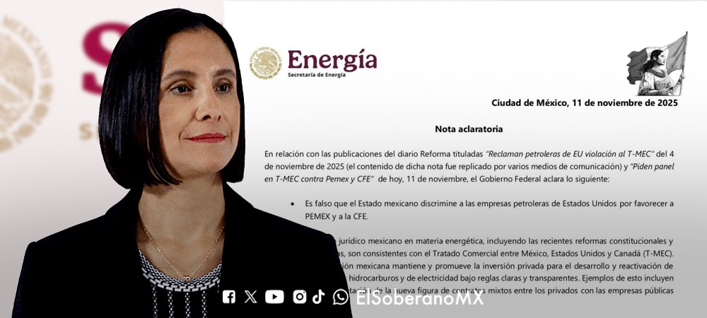 En relación con las publicaciones del diario Reforma tituladas “Reclaman petroleras de EU violación al T-MEC” del 4 de noviembre de 2025 (el contenido de dicha nota fue replicado por varios medios de comunicación) y “Piden panel en T-MEC contra Pemex y CFE” de hoy, 11 de noviembre, el Gobierno Federal aclara lo siguiente: