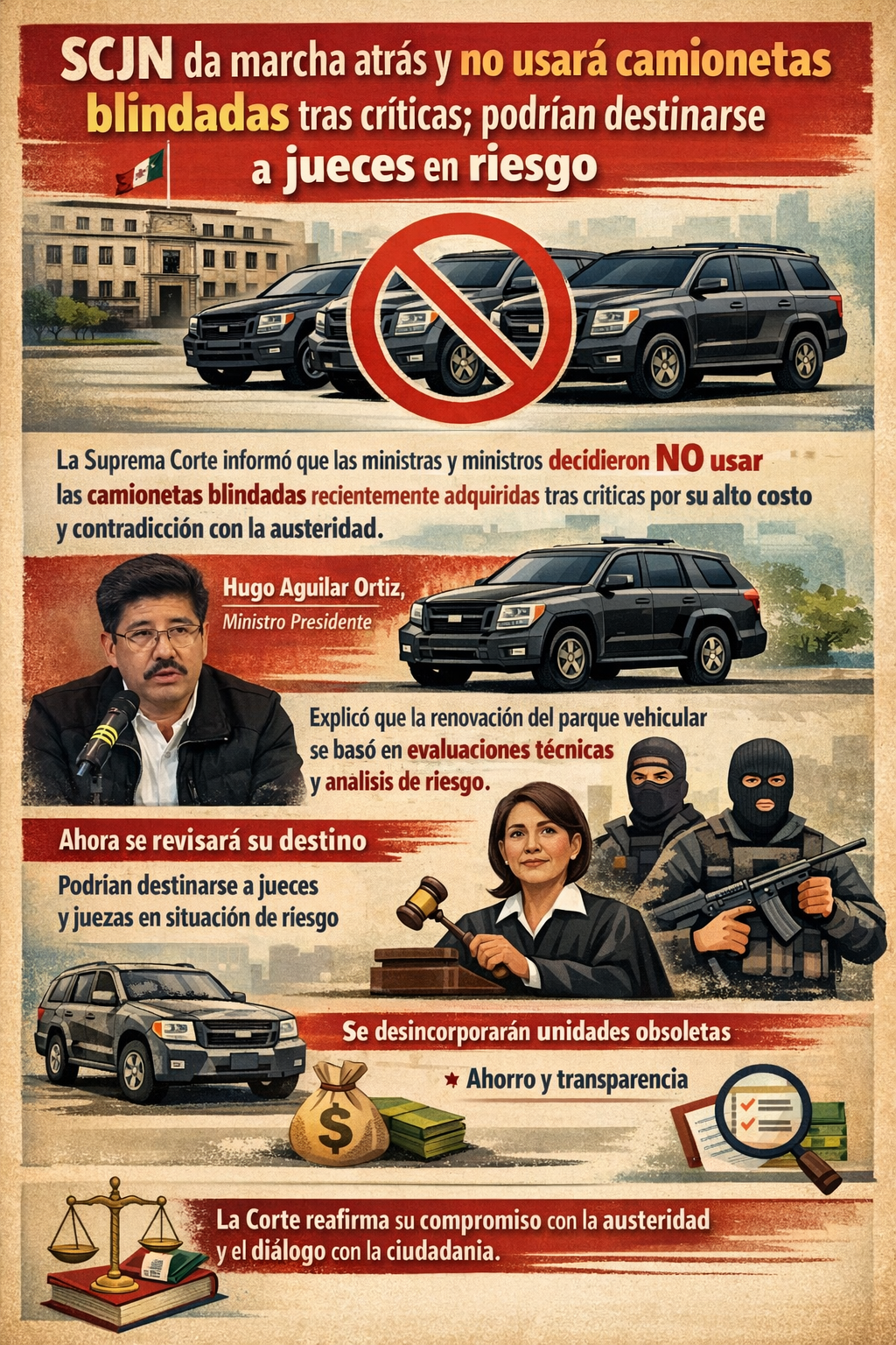 El ministro presidente, Hugo Aguilar Ortiz, explicó que la renovación del parque vehicular se basó en evaluaciones técnicas y análisis de riesgo que advertían el deterioro y la obsolescencia del blindaje de las unidades anteriores, algunas de las cuales presentaron fallas mecánicas y problemas durante traslados por carretera. Sin embargo, señaló que el pleno resolvió revisar la medida tras escuchar la reacción de la opinión pública.