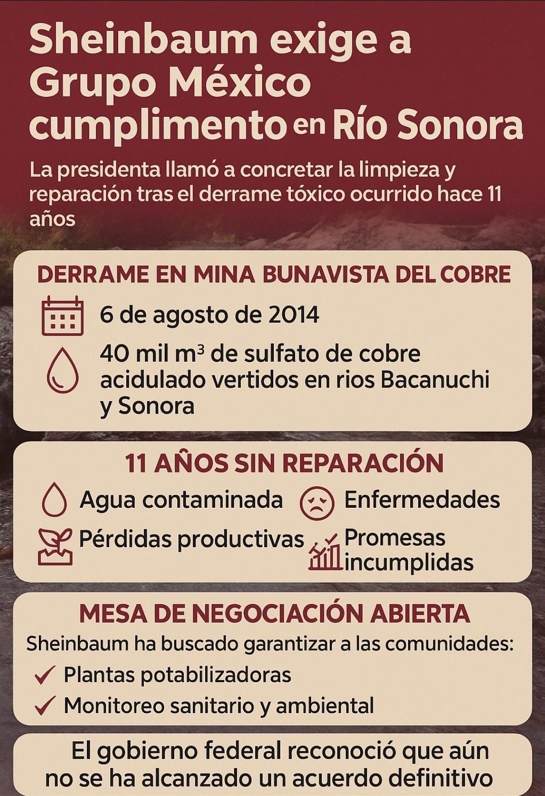 La presidenta Claudia Sheinbaum Pardo reiteró su llamado a Grupo México para que asuma, sin más retrasos, las obligaciones derivadas del derrame tóxico ocurrido en 2014 en el Río Sonora y el Río Bacanuchi, uno de los desastres ambientales más graves en la historia reciente del país.