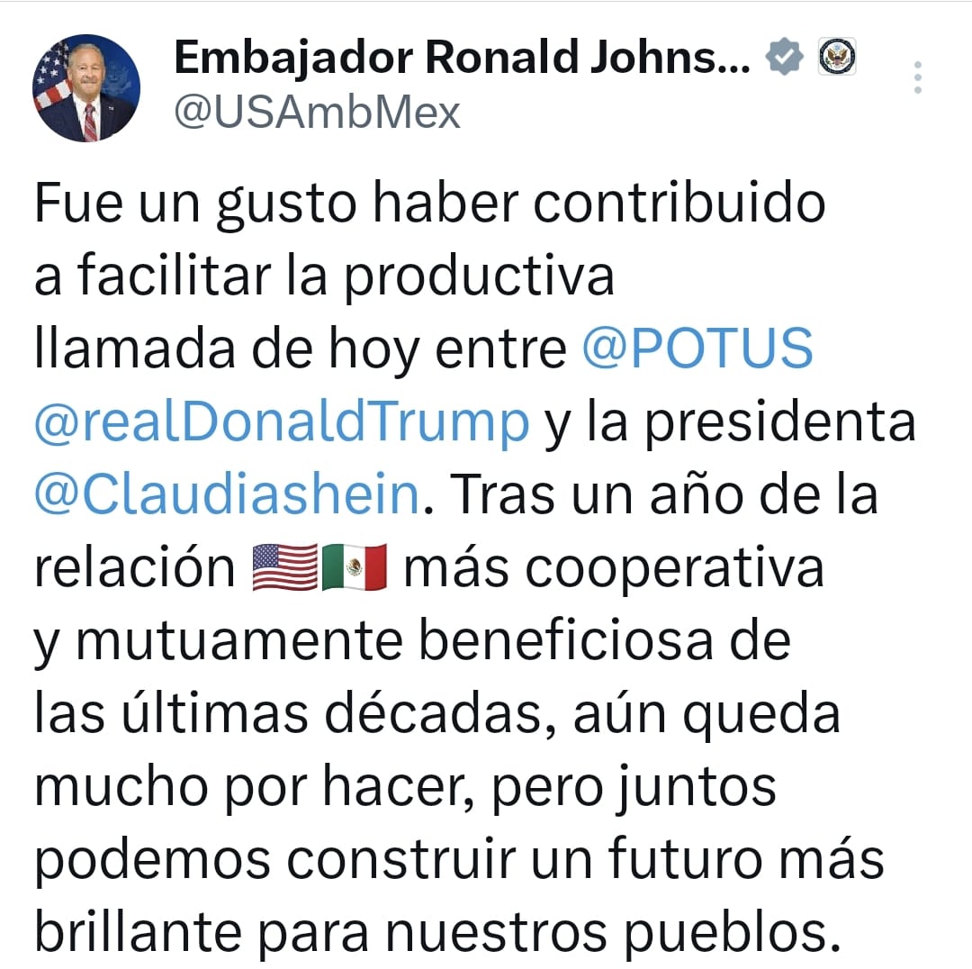 Lo anterior se dio luego de que el embajador de Estados Unidos en México señaló públicamente que: “Fue un gusto haber contribuido a facilitar la llamada entre el presidente Donald Trump y la presidenta Claudia Sheinbaum, y destacó que, tras un año de una relación bilateral cooperativa y mutuamente beneficiosa, aún existen retos por delante, pero también la posibilidad de construir un futuro conjunto en beneficio de ambos pueblos”.