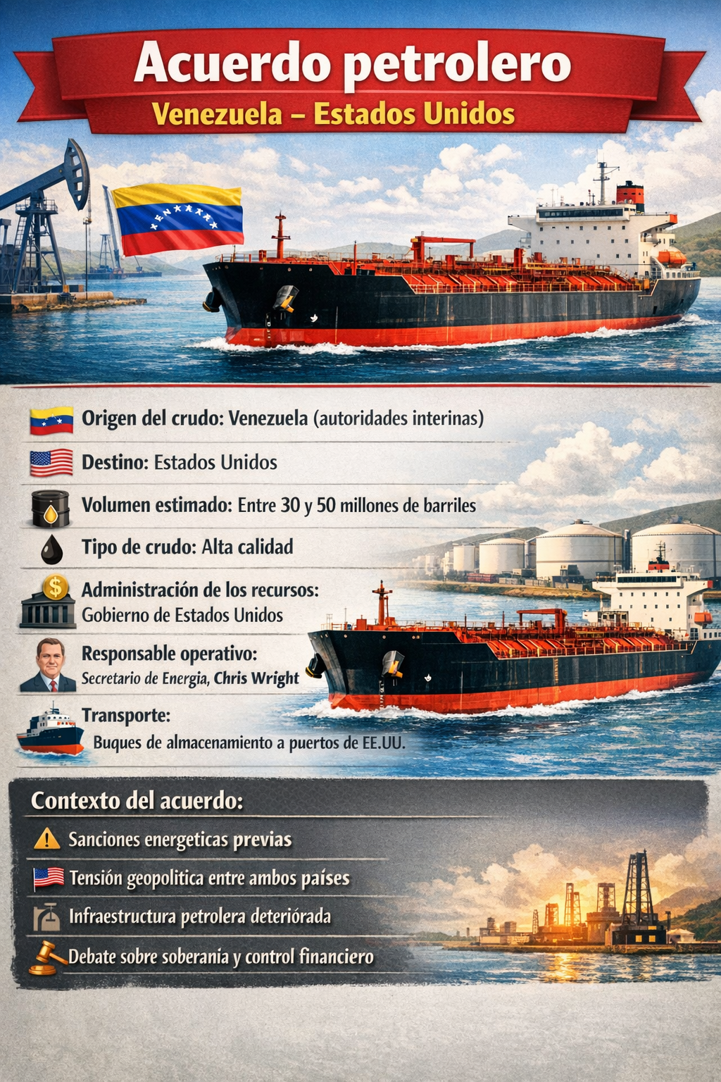 Según el mensaje difundido, el crudo será vendido a precio de mercado y los recursos generados serán controlados directamente por su administración, bajo el argumento de que se destinarán en beneficio del pueblo de Venezuela y de los Estados Unidos.